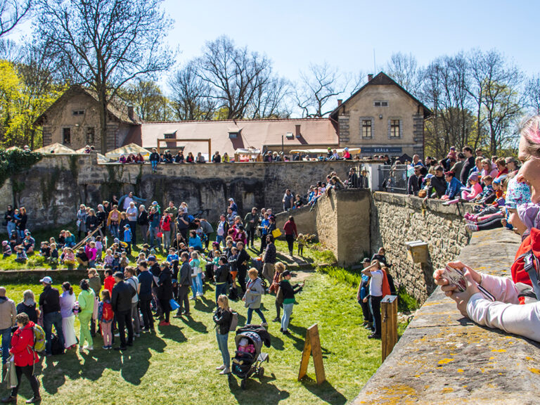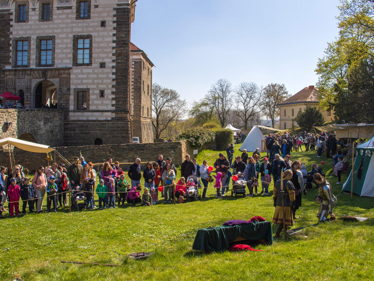 V sobotu 25. dubna návštěvníky čeká kejklíř Puppa, sokolník Václav Šporer, tři vystoupení skupiny Teir, cimbálovka Studánka Fritsch na nádvoří zámku, ukázka kovářského řemesla, šermířská skupina AVE ISTORIA s divadelním představením, Sládkova herna a kreativní dílnička i jízdy na koních.