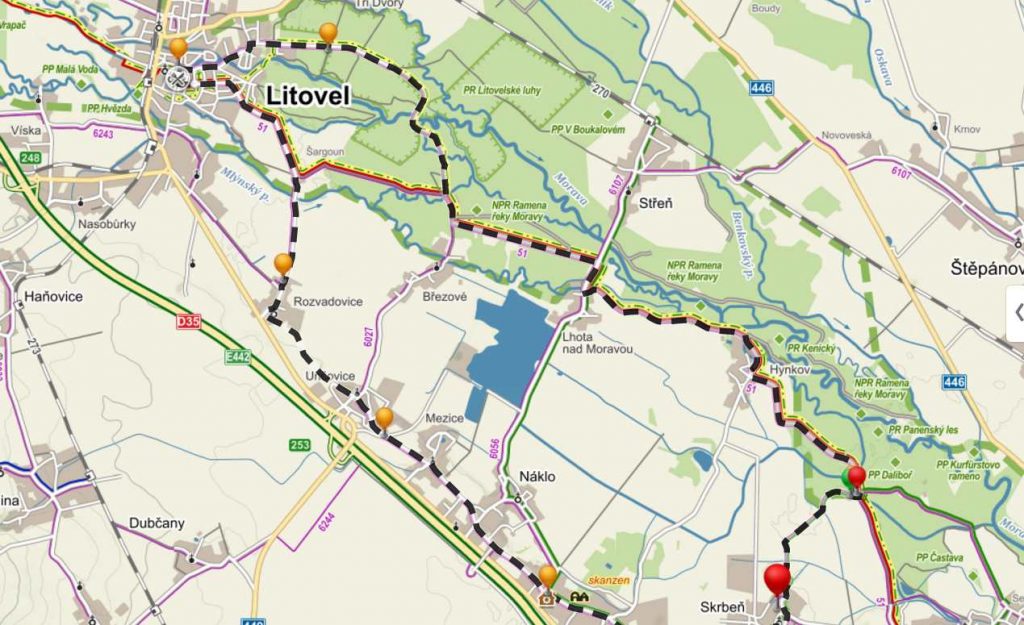 Následně se stáčíme vlevo a pokračujeme CHKO Litovelské Pomoraví. Užíváme si krásné přírody a poklidné jízdy. Přejedeme most přes Bahenku a ocitáme se na trase 6027. Ta nás přivádí zpět na náměstí Přemysla Otakara v Litovli.